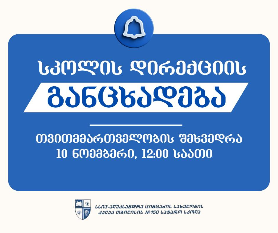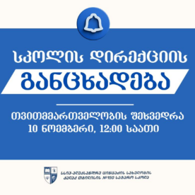 ოთხშაბათს, 10 ნოემბერს, 12:00 საათზე გაიმართება თვითმმართველობასთან შეხვედრა. თვითმმაერთველობის გაერთიანებული შეხვედრა გაიმართება VII-XII კლასის წარმომადგენლებთან. შეხვედრაზე დასწრება სავალდებულოა.